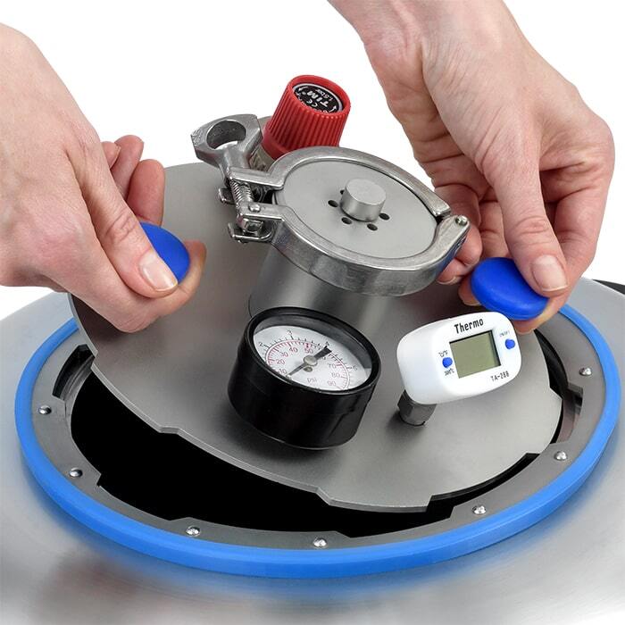 Безопасная транспортировка. Самые хрупкие части автоклава — термометр и манометр на крышке. Просто переверните крышку и установите ее приборами внутрь автоклава — это обеспечит безопасную перевозку на любые расстояния.