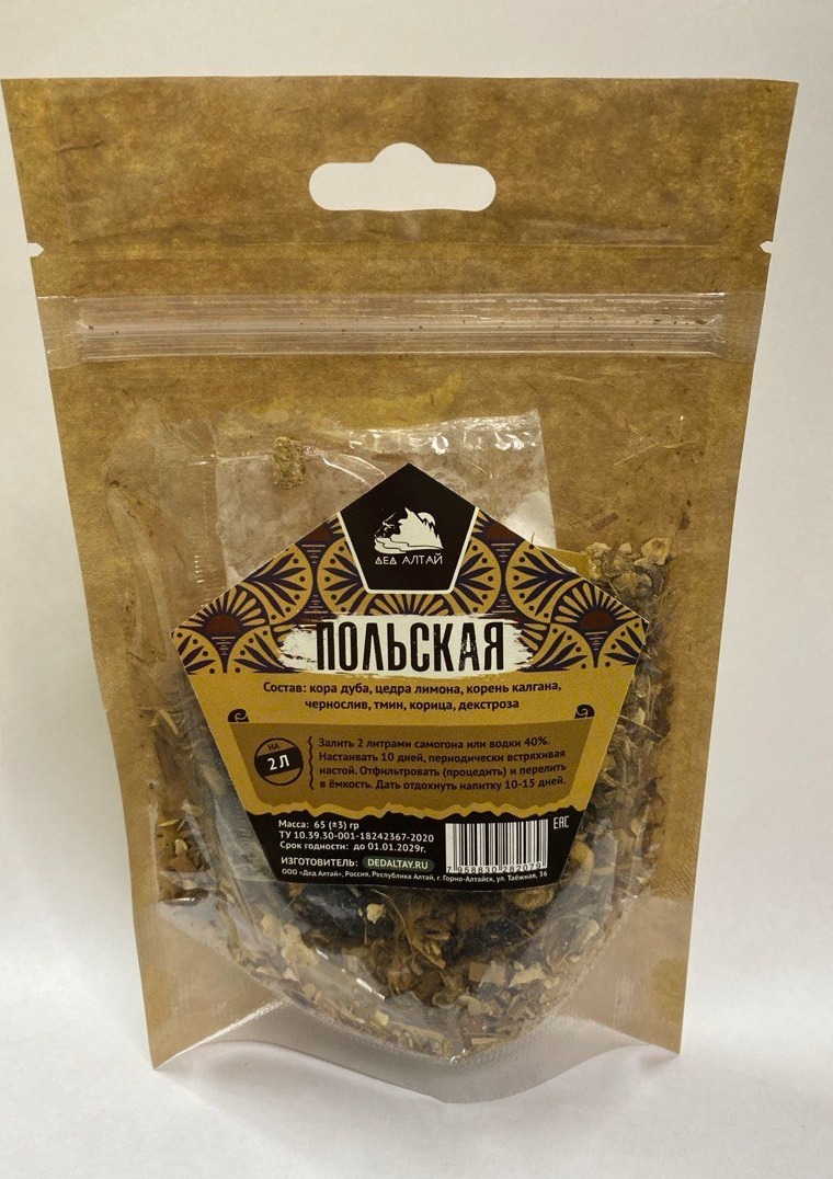 Набор для приготовления настойки "Польская" от "Дед Алтай" — набор для настойки по традиционным польским рецептам, благодаря этому стираются границы между государствами и мы можем погрузится в польскую культуру застолья наслаждаясь оригинальным напитком. С этим набором вы сможете легко приготовить настойку, которая станет настоящим украшением вашего стола и порадует вас и ваших гостей. Набор станет прекрасным подарком для друга, папы или мужа на Новый год, день рождения или 23 февраля. Подойдет как для начинающих, так и для опытных мастеров, желающих приготовить настойку для самогона виски своими руками. Следуя инструкции на упаковке, вы сможете создать настойку, которая станет настоящим украшением вашего стола и удивит ваших гостей своим вкусом и ароматом.